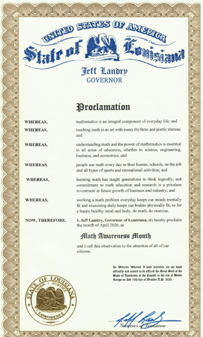 With the support of Louisiana State Governor Jeff Landry, the LSU Mathematics Department has officially commenced Math Awareness Month on Wednesday, April 1, 2026. The purpose of this month is to raise awareness about the importance of a solid foundation in mathematics education early on. As the founder and former CEO of Art of Problem Solving (AoPS), Richard Rusczyk stated that we have an obligation to train the next generation of problem-solvers by emphasizing deep, conceptual understanding of mathematics rather than rote memorization, as this is the method to get more enthusiasm surrounding the subject, which will become necessary due to the increasing number of high-end careers requiring strong mathematical reasoning skills.